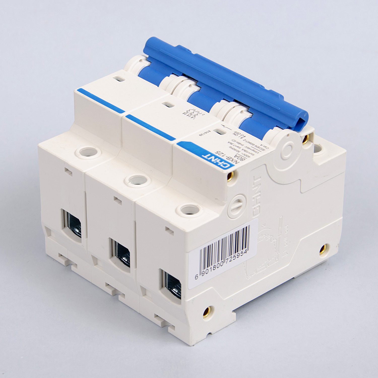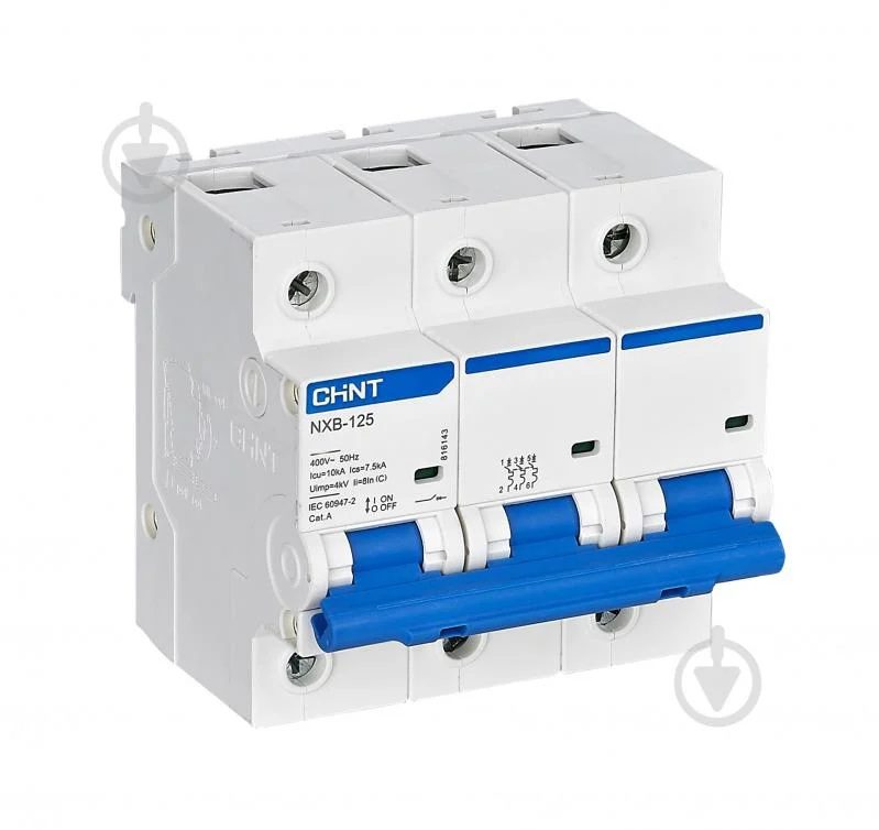 CHNT Ավտոմատ անջատիչ 4.5kA 3P C125A Եռաֆազ ավտոմատ անջատիչ՝ 125A հոսանքի և 4.5kA անջատման կարողությամբ։ Պաշտպանում է շղթան գերծանրաբեռնվածությունից և կարճ միացումից։ Տեղադրվում է DIN ռեյկայի վրա։