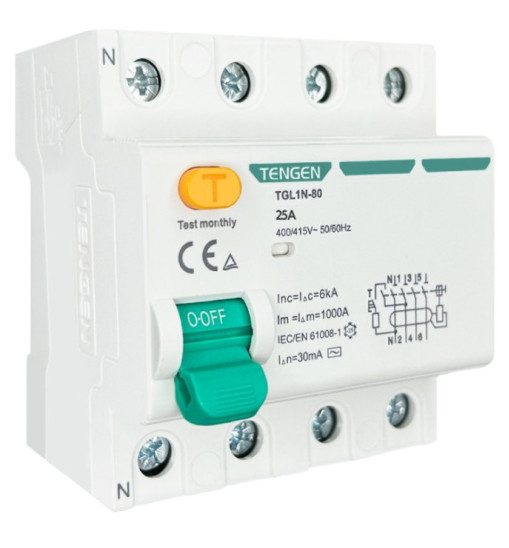 The 4P 80 25A 30mA AC Residual Current Circuit Breaker (RCCB) is designed to protect people from electric shock and safeguard three-phase electrical circuits from short circuits and overcurrent. The device trips at 30mA leakage current, ensuring reliable and safe operation in industrial and commercial applications. DIN-rail mounting allows easy installation.