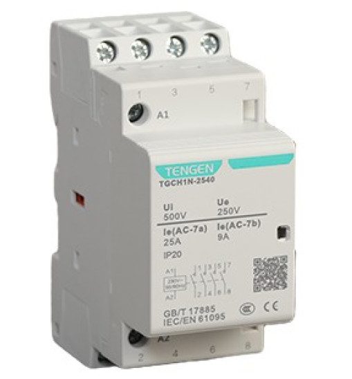 The TENGEN TG-6340 Modular Contactor is designed for automatic control of high-current electrical loads in residential and industrial systems. It features four poles (4P) with a rated current of up to 63A, providing reliable switching for lighting, heating, HVAC, and pump systems. DIN-rail mounting ensures long-lasting, silent operation.
